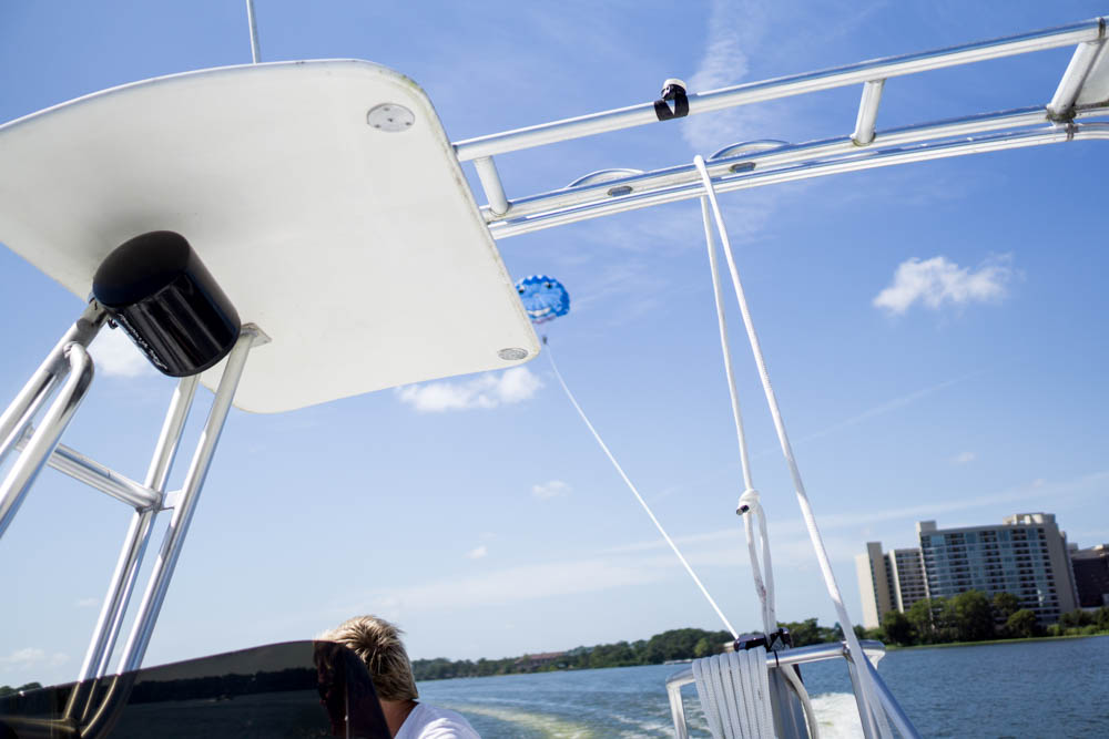 Our boat arrives and we climb on board. The boat heads out to the lake and in no time Jack and I are getting suited and booted to be clipped onto a parachute which will float us on 600ft of line and get us up to a height of 400ft.